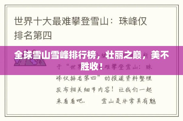 雪山,作为大自然赋予人类的一大壮丽景观,以其雄伟、神秘和崇高的形象吸引着无数探险者和游客,在世界各地,有许多著名的雪山雪峰,它们以其独特的魅力吸引着人们的目光,以下是世界雪山雪峰的排名,让我们一起领略这些令人叹为观止的自然奇观。